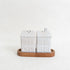 Set of 3 – includes two shakers and one wooden tray. Food safe.